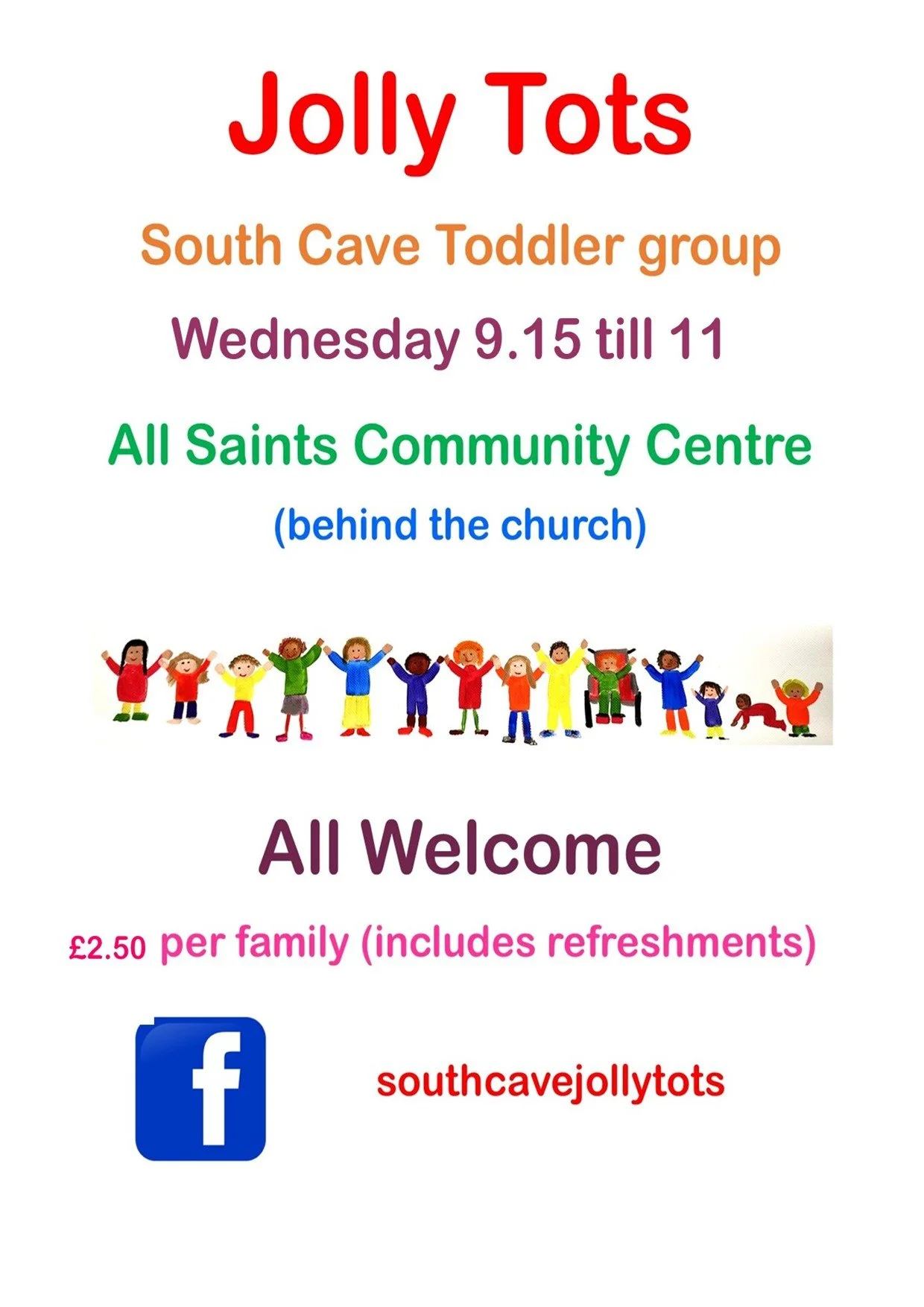 Jolly Tots is South Cave’s own toddler group. There is always lots to do and lovely friends to make. Refreshments, snack time and singing time. All welcome.